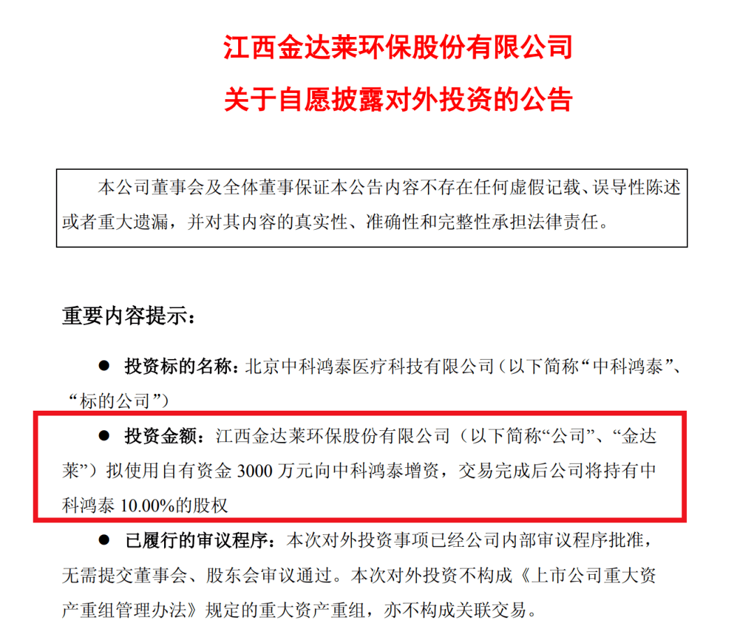 工作发生正在12月21号晚上,金达莱发了一则通知布告,内容很间接:打算用3000万元自有资金,对一家叫“中科鸿泰医疗科技无限公司”的企业进行增资。