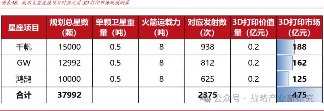 其“快速阐发取制制推进手艺”(RAMPT)项目专注于开辟新型合金及大型部件的增材制制手艺,项目起头四年过程中,NASA已利用新开辟的极端合金、大型增材制制工艺和先辈的复合材料手艺,对3D打印的喷射器、喷嘴和燃烧室硬件进行了500次尝试,合计跨越16000秒。该项目还已起头为从力RS-25策动机开辟全尺寸版本,这能够将其成本降低高达70%,并将制制时间缩短一半。航天 3D 打印市场规模测算,3 大星座项目对应 2000 余次发射,带来 475 亿元 3D 打印累积市场规模。我们对 3D 航天打印市场规模进行测算:目前我国有 3 个大型星座项目,别离为千帆、GW、鸿鹄,规划卫星数量别离为 1。5、1。3、1 万颗,假设单颗卫星分量 0。5 吨,单枚火箭运载能力 8 吨,则需要 2375 次发射才能满脚 3 大星座项目对应的总卫星并轨需求。假设单枚火箭策动机 3D 打印价值量为 2000 万元,正在不考虑策动机反复利用的环境下,则我国航天 3D 打印市场规模无望累积达 475 亿元。