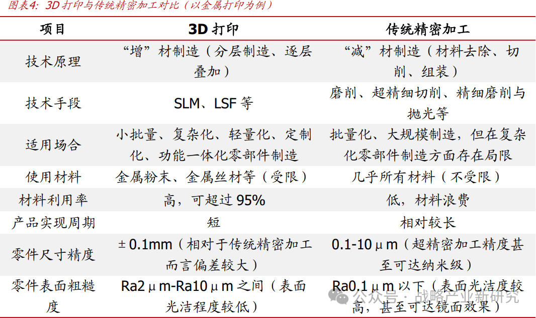 保守的工业制制方式是“减材制制”,通过车削、刨、铣等工艺,将大块的原始材料“削减”加工成所需外形、尺寸和质量的器件。但若是要制制外形复杂或者大型的布局件,保守制制经常面对加工成型性的问题,需要先加工多个简单零部件然后再拆卸,因而设想空间无限。此外,保守制制经常需要切削掉大量材料,因而加工成本高,材料操纵率低。取保守的“减材”制制方式相反,3D 打印制制手艺是“增材”,以计较机三维数字模子为根本,操纵激光等高能热源将原料以分层叠加的体例逐层熔化、堆积,最终获得方针实体。